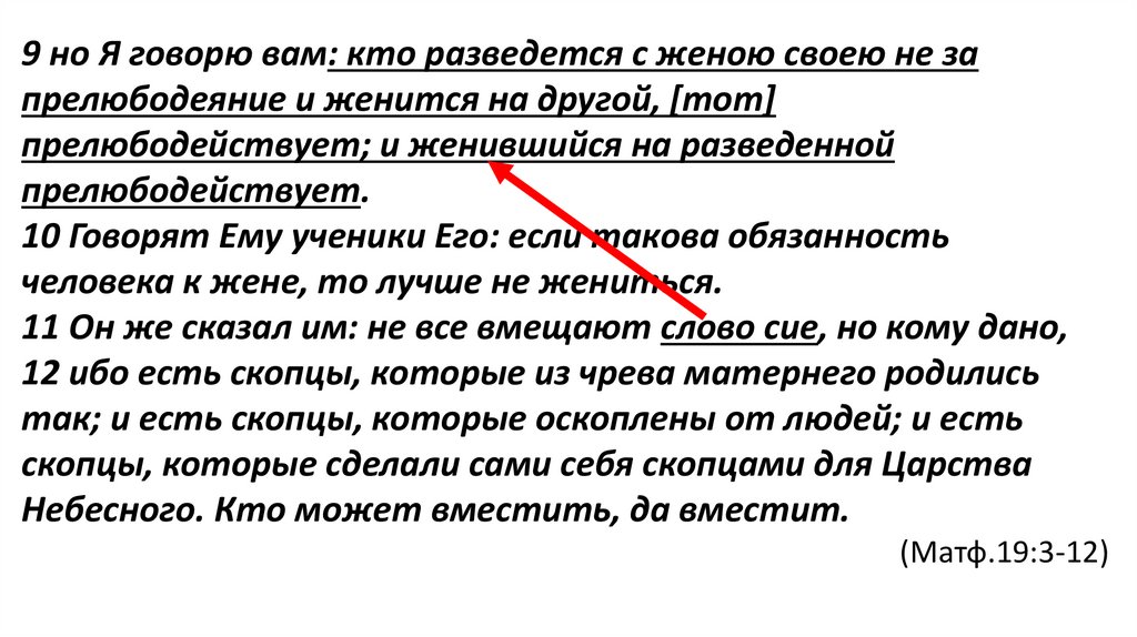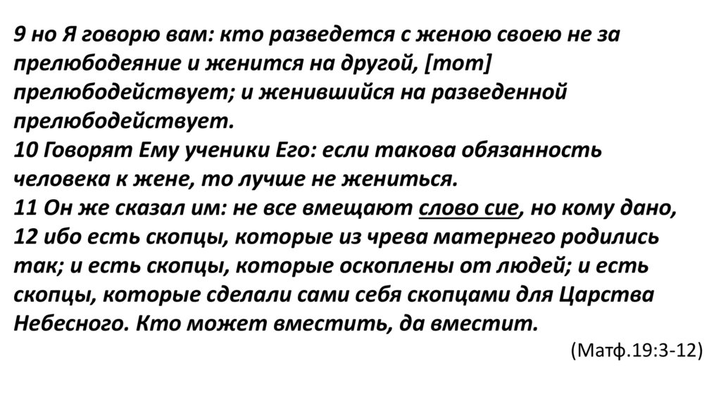 9 но Я говорю вам: кто разведется с женою своею не запрелюбодеяние и женится на другой, [тот]