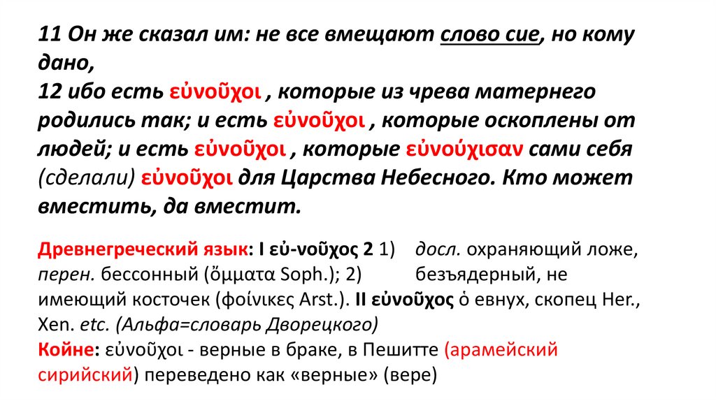 Койне: εὐνοῦχοι - верные в браке, в Пешитте (арамейский