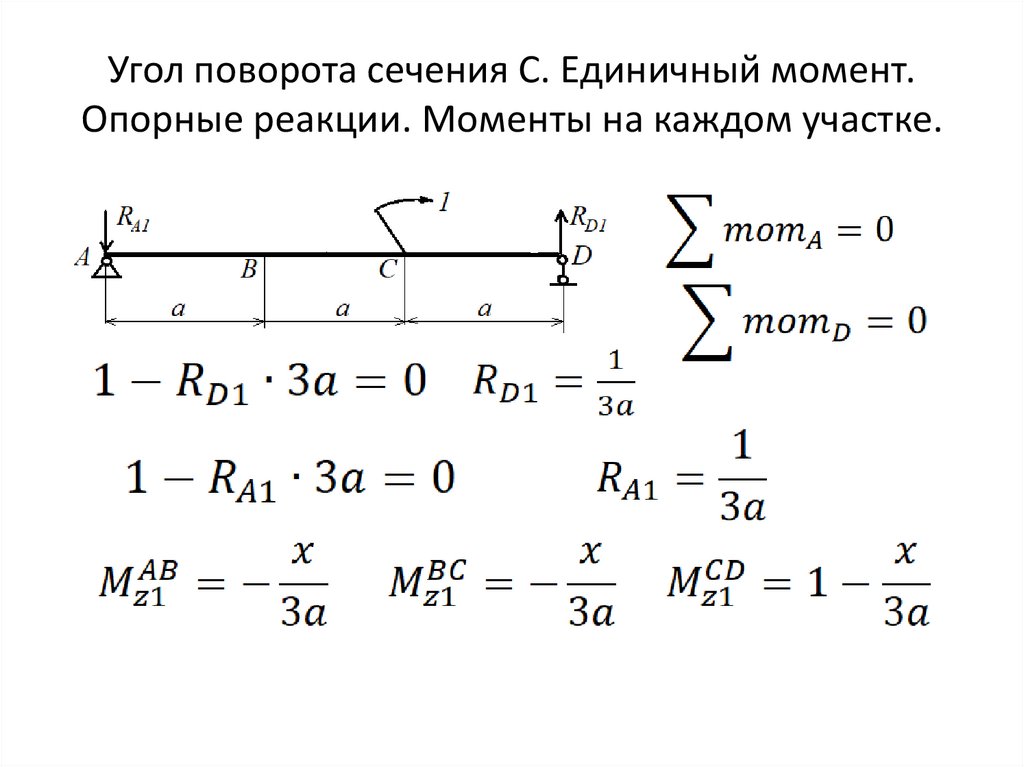 Угол поворота сечения С. Единичный момент.Опорные реакции. Моменты на каждом участке.