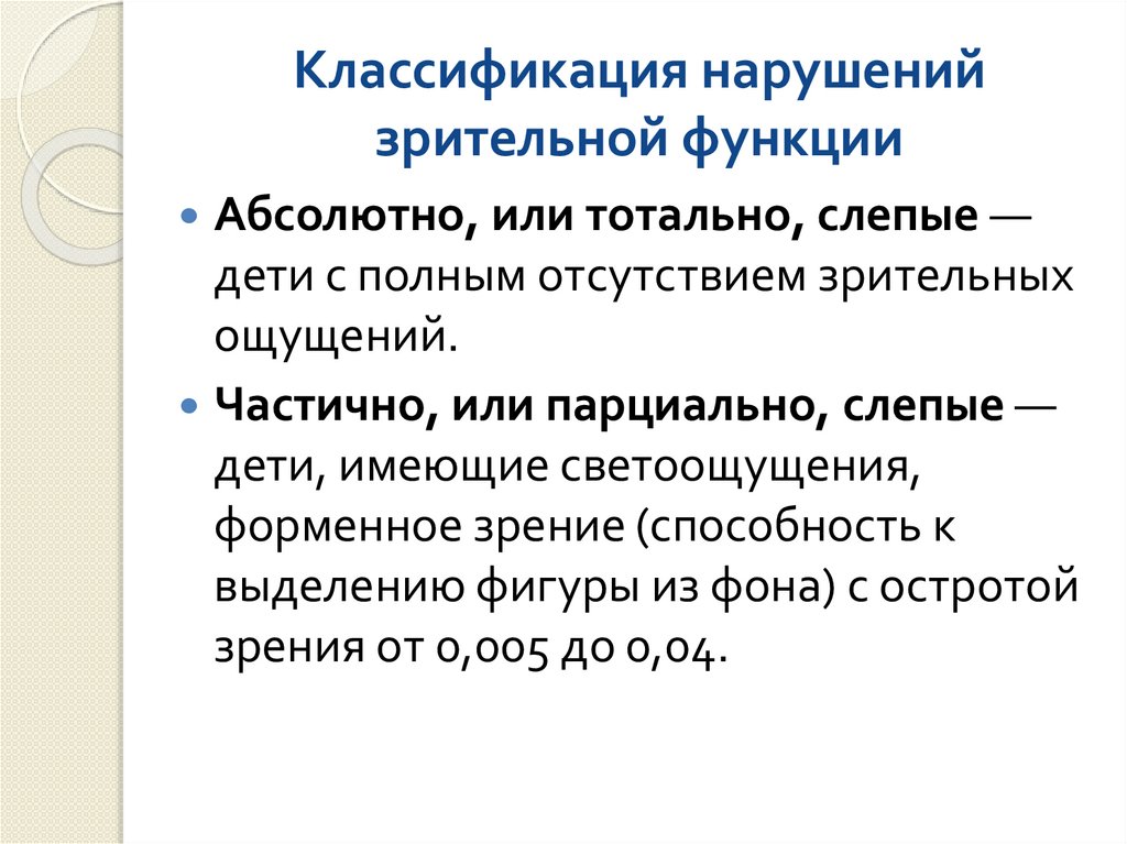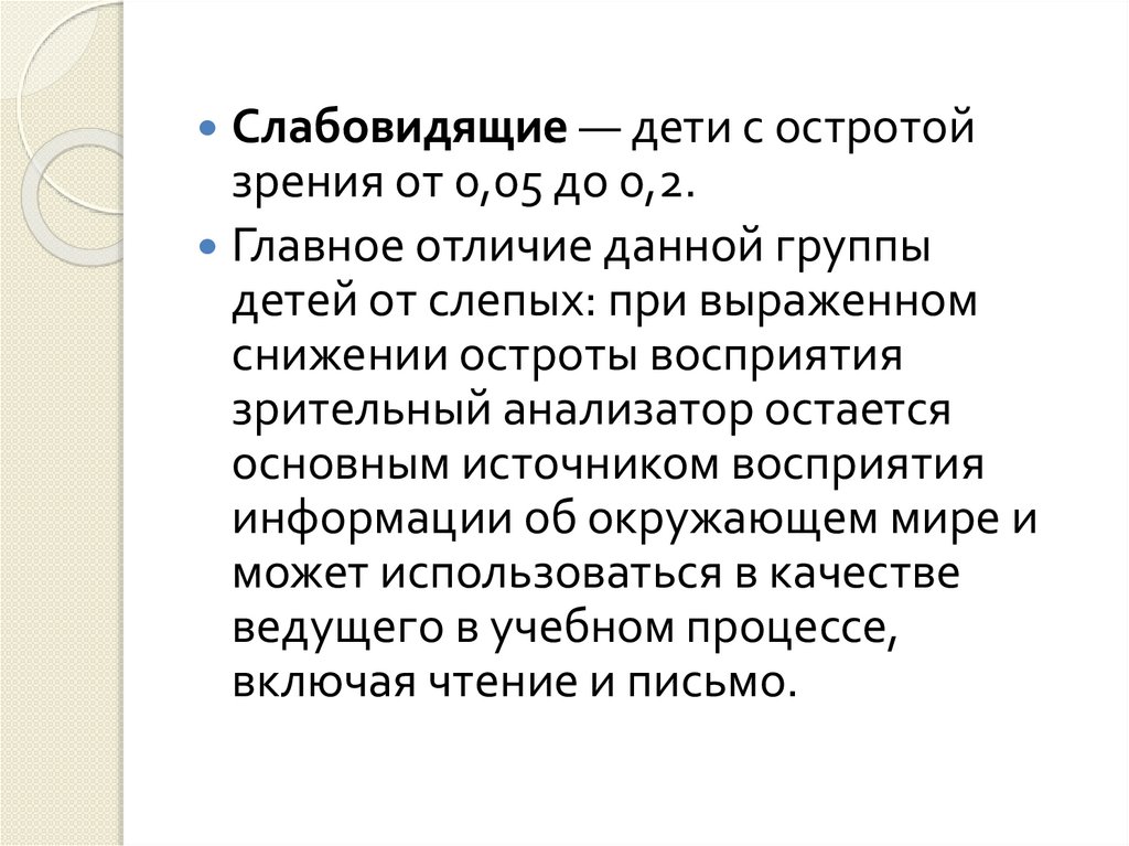 Слабовидящие — дети с остротойзрения от 0,05 до 0,2.