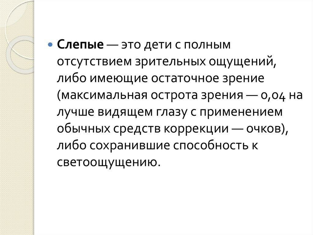 Слепые — это дети с полнымотсутствием зрительных ощущений,