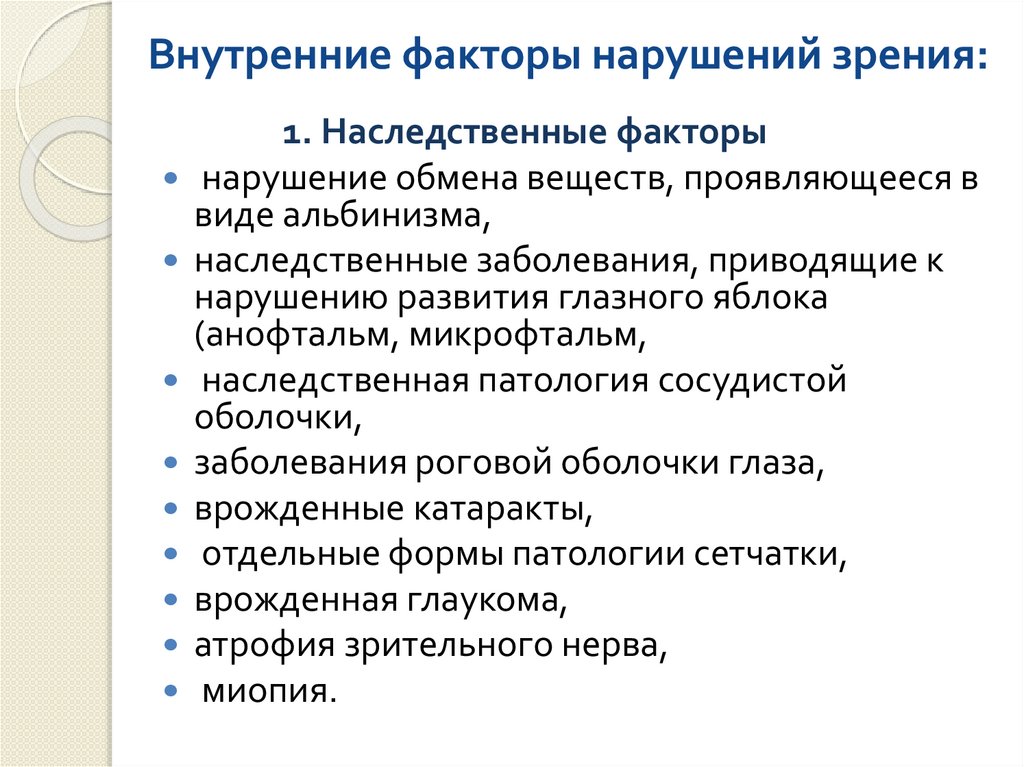 Внутренние факторы нарушений зрения:1. Наследственные факторы