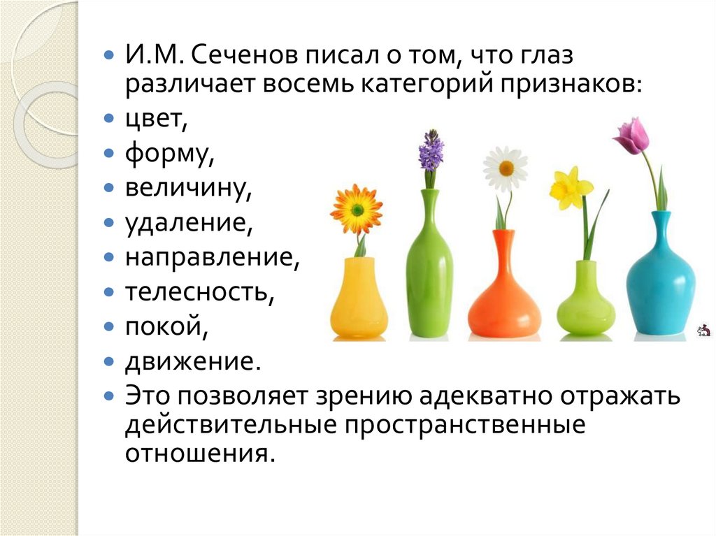 И.М. Сеченов писал о том, что глазразличает восемь категорий признаков: