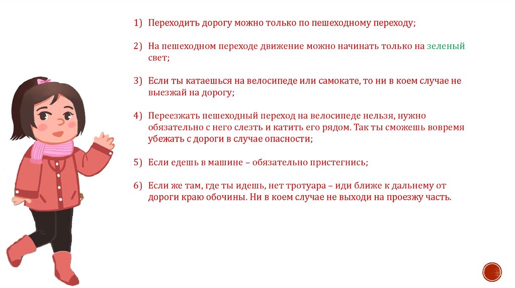 1) Переходить дорогу можно только по пешеходному переходу;2) На пешеходном переходе движение можно начинать только на зеленый