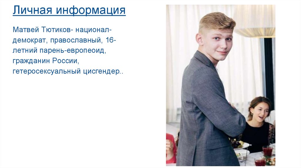 Личная информацияМатвей Тютиков- националдемократ, православный, 16летний парень-европеоид,