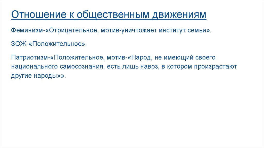 Отношение к общественным движениямФеминизм-«Отрицательное, мотив-уничтожает институт семьи».