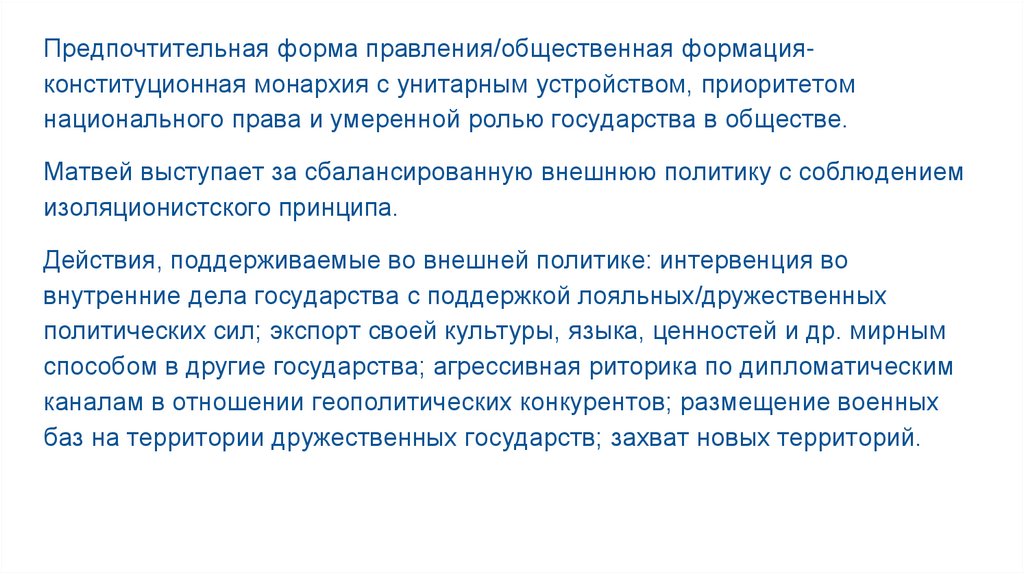 Матвей выступает за сбалансированную внешнюю политику с соблюдением