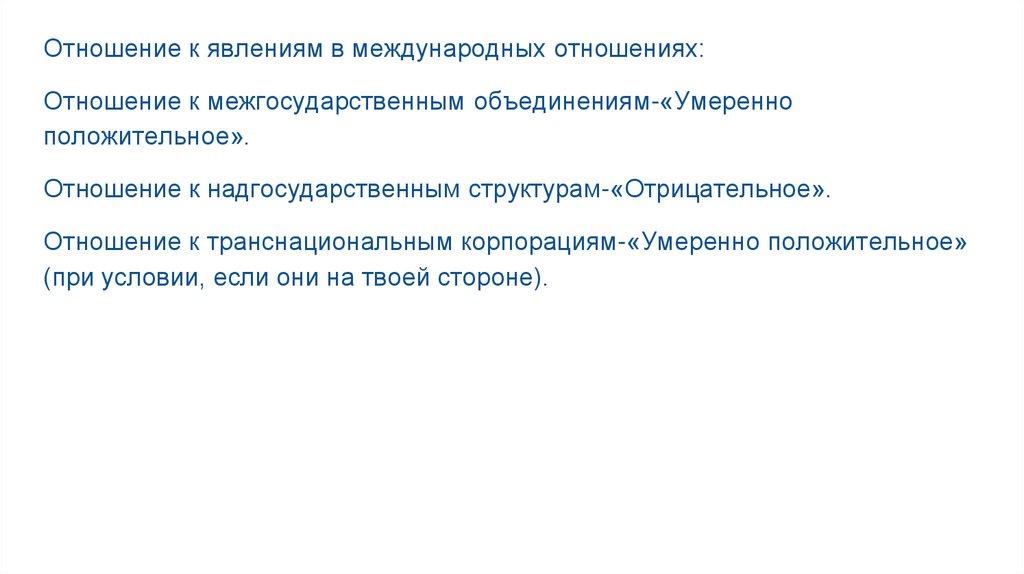 Отношение к явлениям в международных отношениях:Отношение к межгосударственным объединениям-«Умеренно