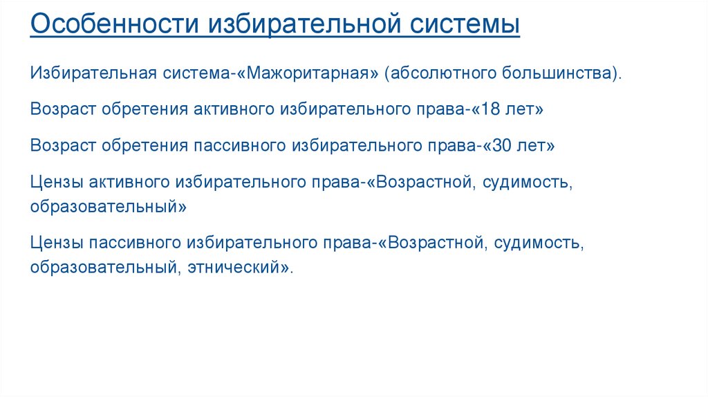 Особенности избирательной системыИзбирательная система-«Мажоритарная» (абсолютного большинства).