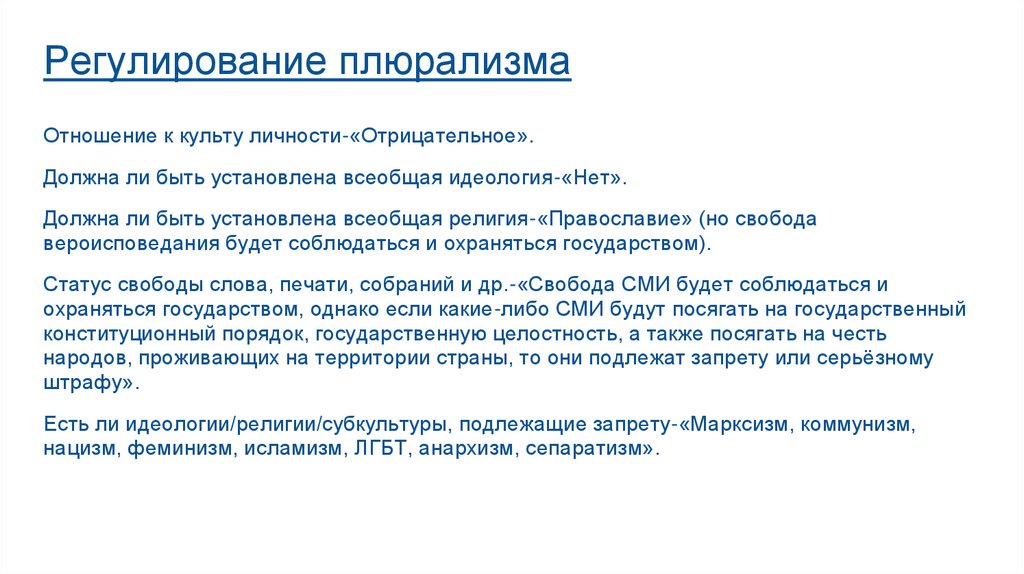 Регулирование плюрализмаОтношение к культу личности-«Отрицательное».