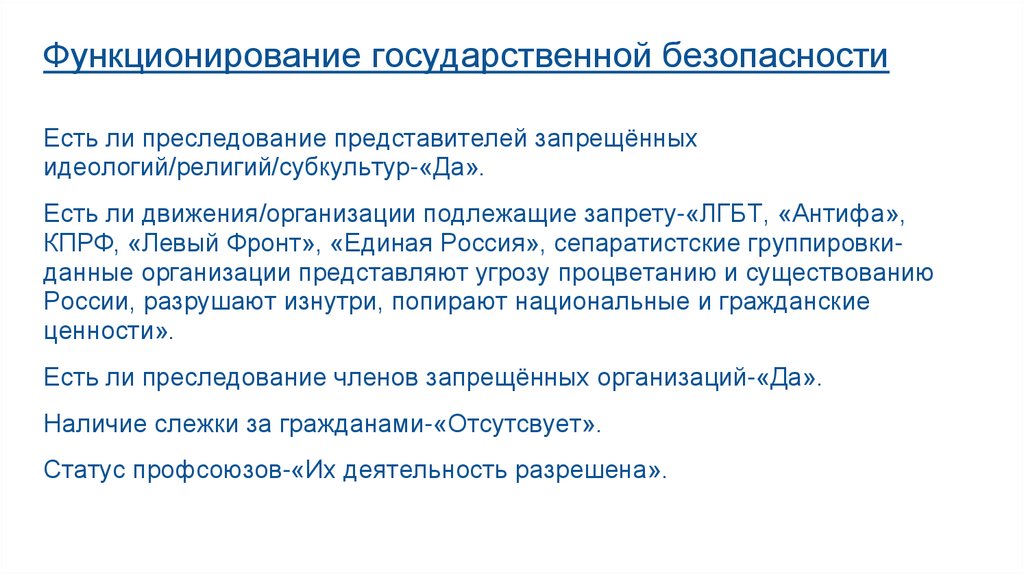 Функционирование государственной безопасностиЕсть ли преследование представителей запрещённых