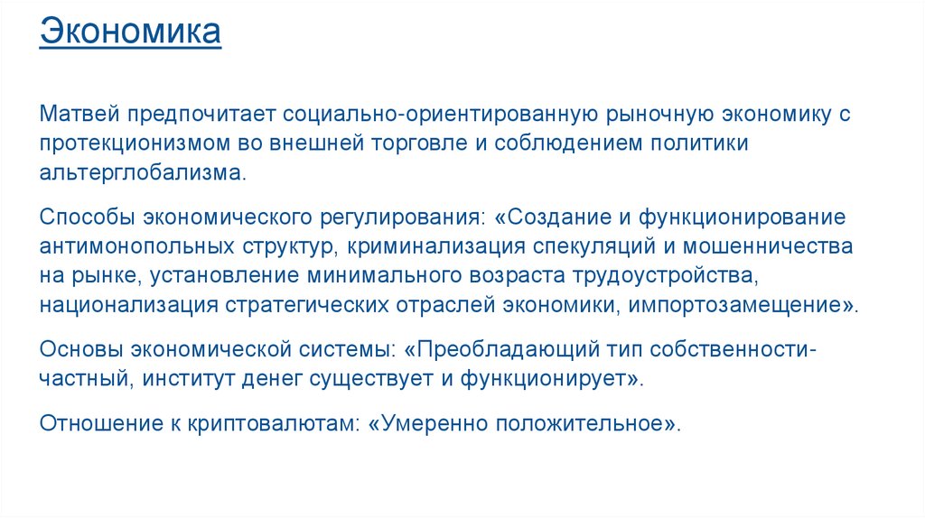 ЭкономикаМатвей предпочитает социально-ориентированную рыночную экономику с