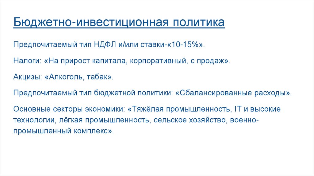 Бюджетно-инвестиционная политикаПредпочитаемый тип НДФЛ и/или ставки-«10-15%».