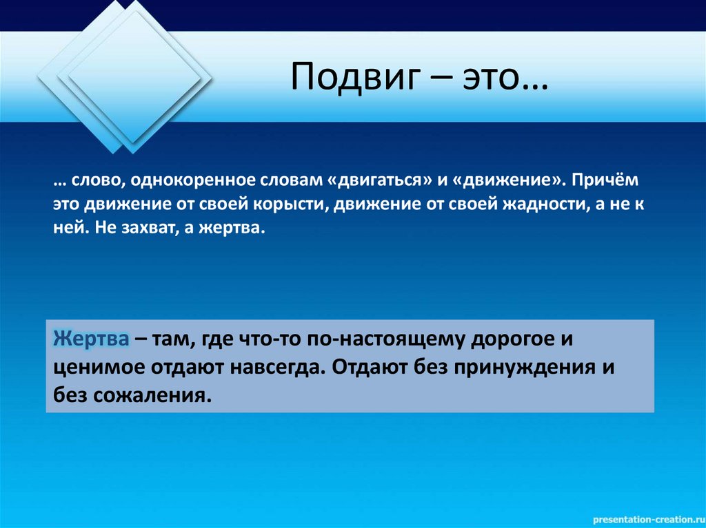 Подвиг – это…… слово, однокоренное словам «двигаться» и «движение». Причём
