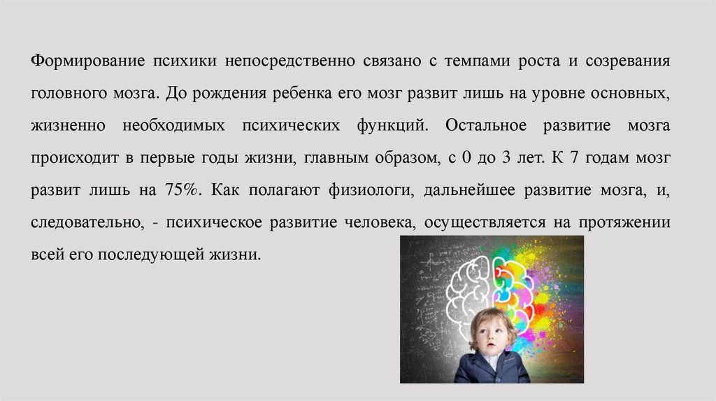 Формирование психики непосредственно связано с темпами роста и созреванияголовного мозга. До рождения ребенка его мозг развит лишь на уровне основных,