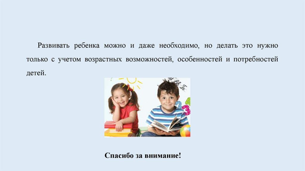 Развивать ребенка можно и даже необходимо, но делать это нужнотолько с учетом возрастных возможностей, особенностей и потребностей