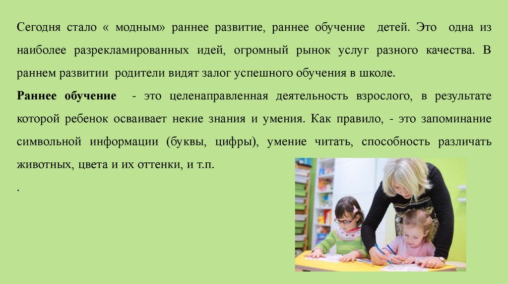 Сегодня стало « модным» раннее развитие, раннее обучение детей. Это одна изнаиболее разрекламированных идей, огромный рынок услуг разного качества. В