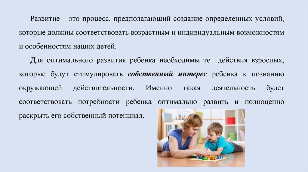 Развитие – это процесс, предполагающий создание определенных условий,которые должны соответствовать возрастным и индивидуальным возможностям