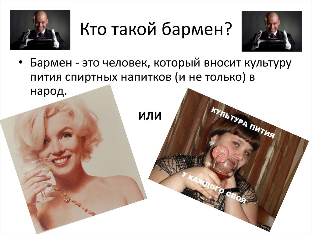 Кто такой бармен?• Бармен - это человек, который вносит культуру