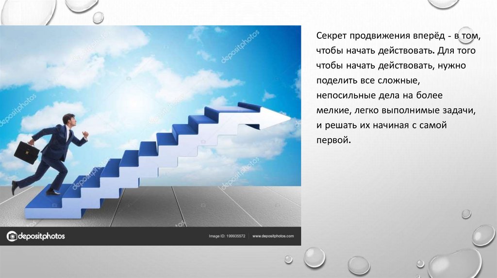 Секрет продвижения вперёд - в том,чтобы начать действовать. Для того
