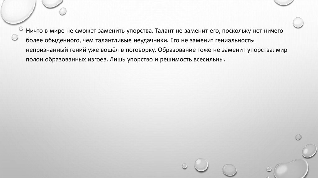 Ничто в мире не сможет заменить упорства. Талант не заменит его, поскольку нет ничегоболее обыденного, чем талантливые неудачники. Его не заменит гениальность:
