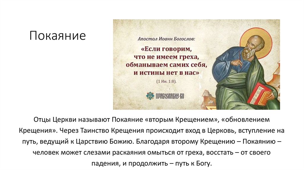 ПокаяниеОтцы Церкви называют Покаяние «вторым Крещением», «обновлением
