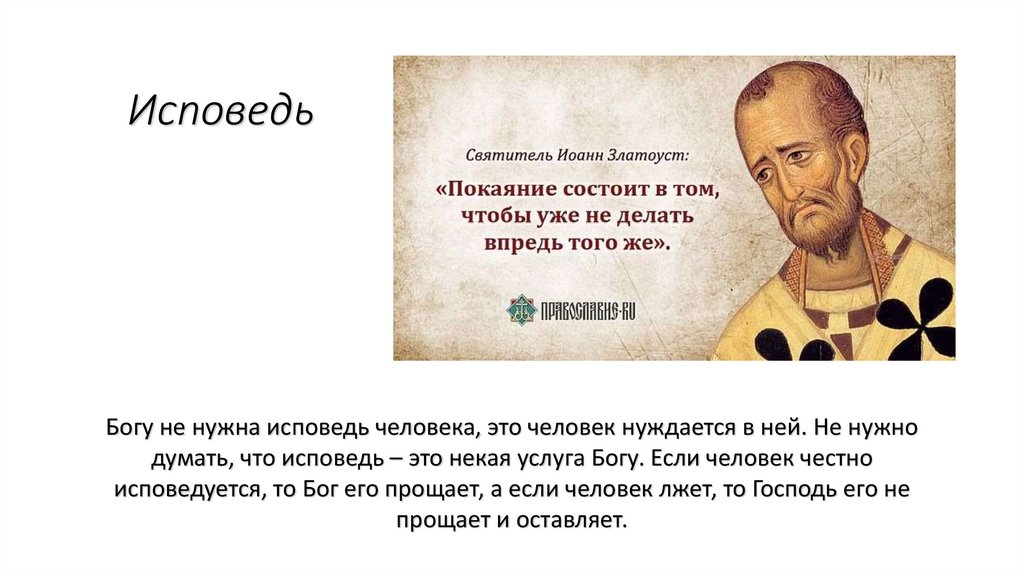 ИсповедьБогу не нужна исповедь человека, это человек нуждается в ней. Не нужно