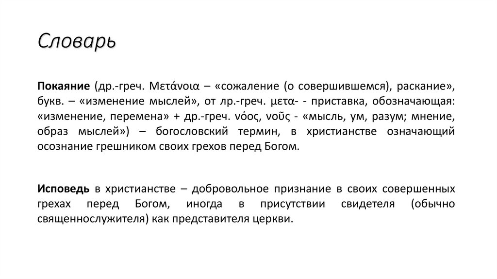 СловарьПокаяние (др.-греч. Μετάνοια – «сожаление (о совершившемся), раскание»,