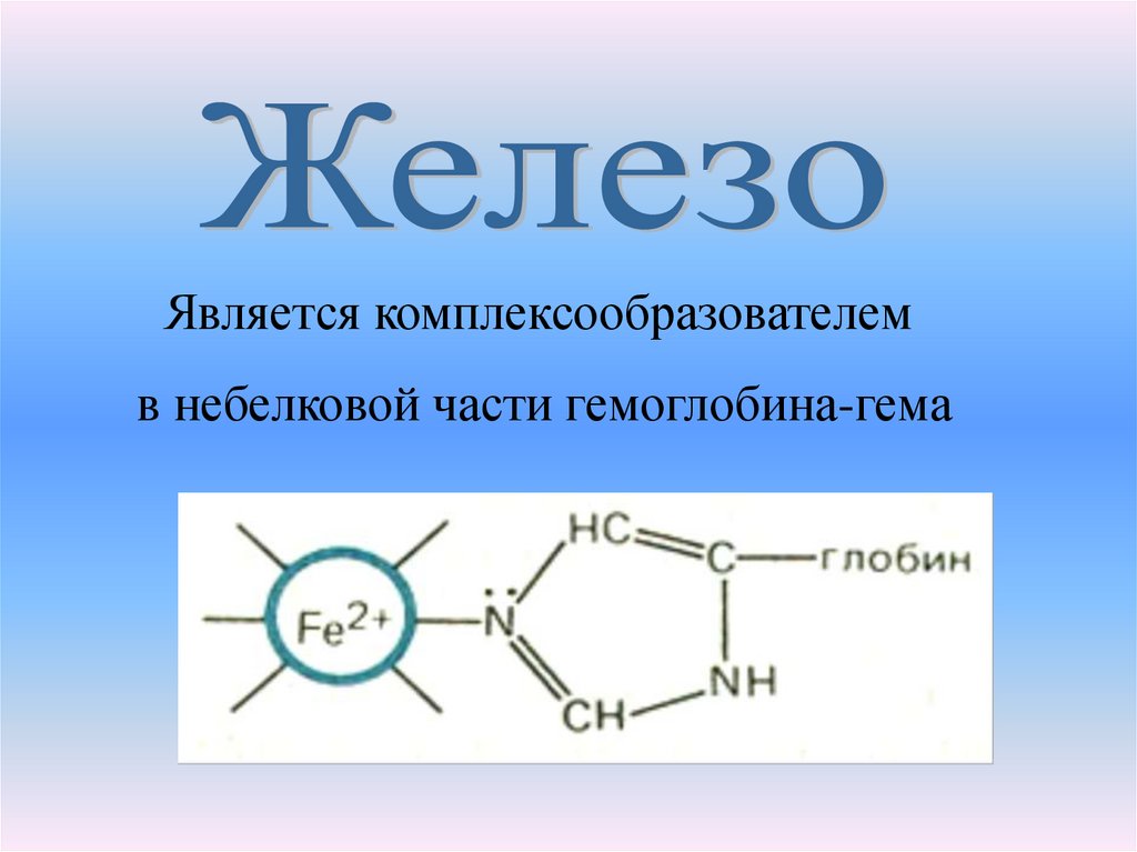 Является комплексообразователемв небелковой части гемоглобина-гема