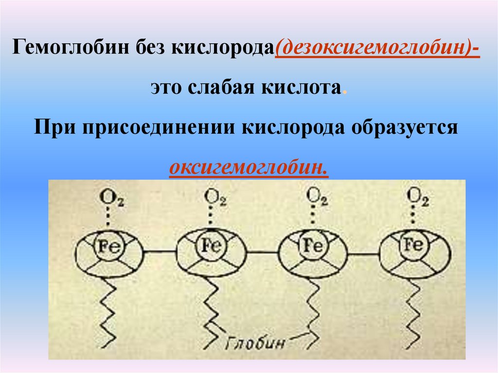 Гемоглобин без кислорода(дезоксигемоглобин)это слабая кислота.При присоединении кислорода образуется