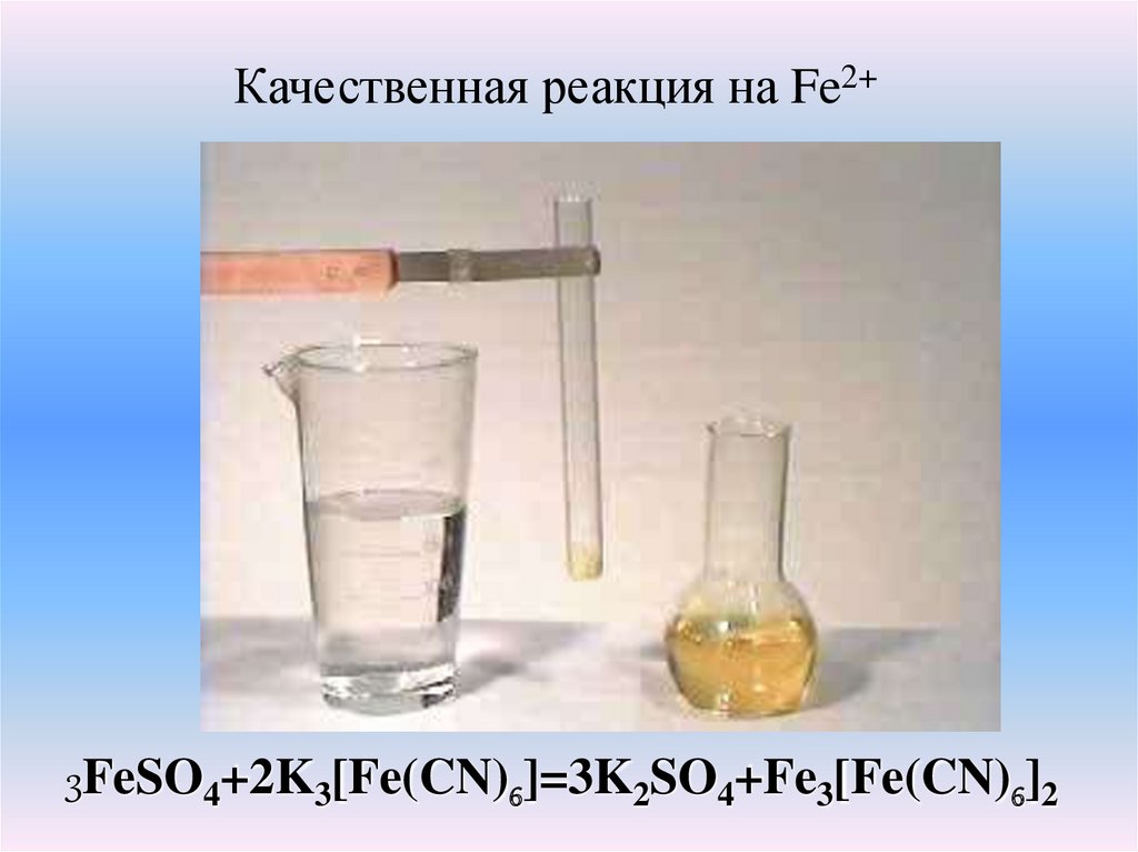 Качественная реакция на Fe2+3FeSO4+2K3[Fe(CN)6]=3K2SO4+Fe3[Fe(CN)6]2