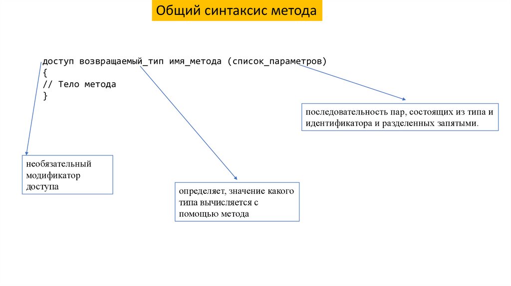Общий синтаксис методадоступ возвращаемый_тип имя_метода (список_параметров)