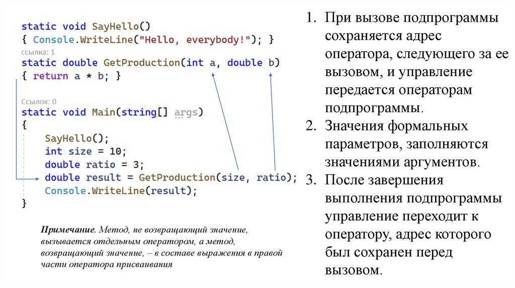 Примечание. Метод, не возвращающий значение,вызывается отдельным оператором, а метод,