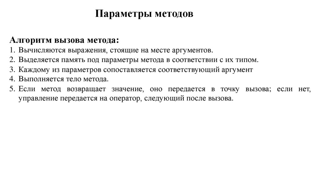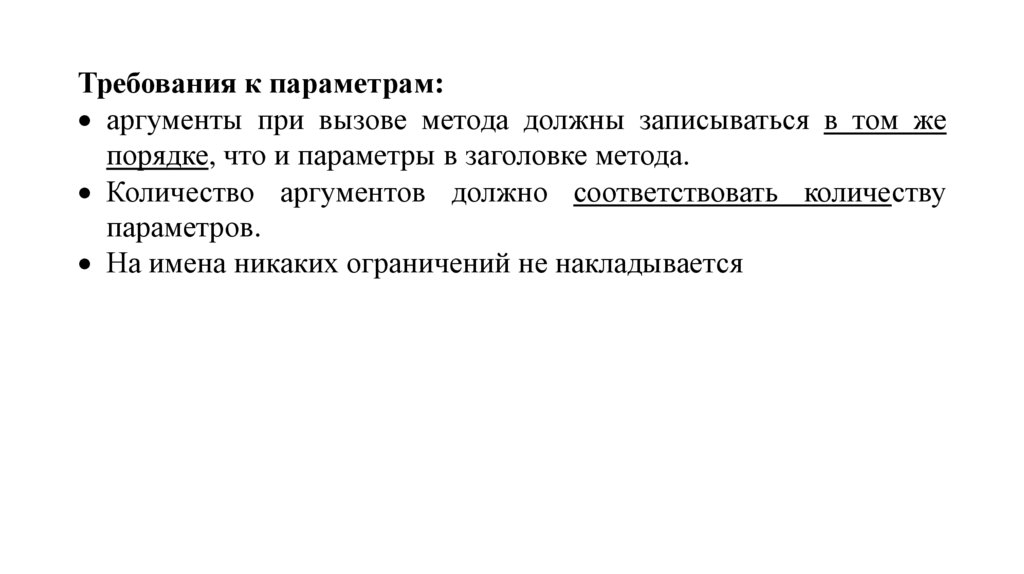 Требования к параметрам:аргументы при вызове метода должны записываться в том же