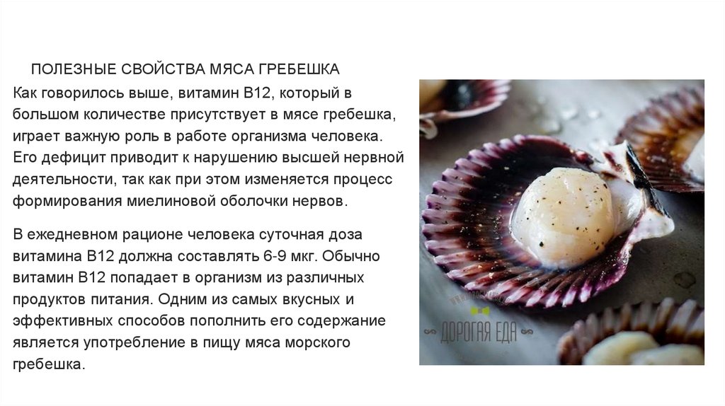 ПОЛЕЗНЫЕ СВОЙСТВА МЯСА ГРЕБЕШКАКак говорилось выше, витамин В12, который в