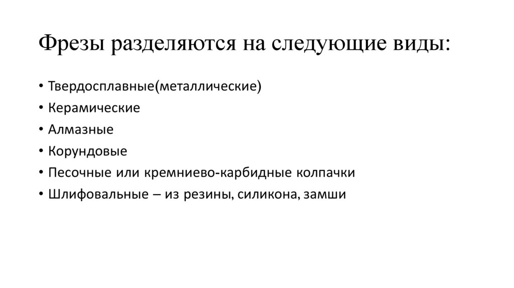 Фрезы разделяются на следующие виды:• Твердосплавные(металлические)