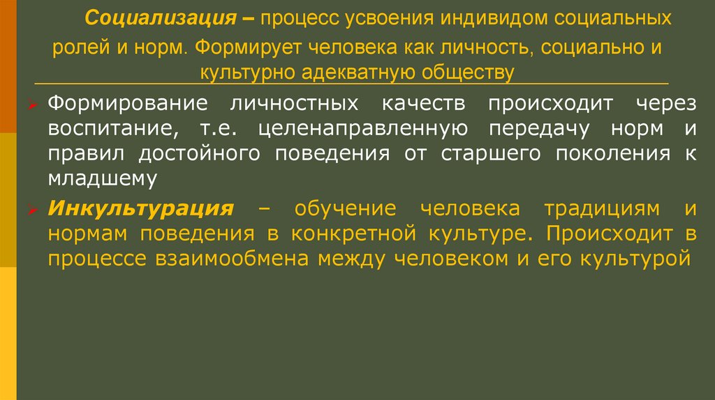 Социализация – процесс усвоения индивидом социальныхролей и норм. Формирует человека как личность, социально и