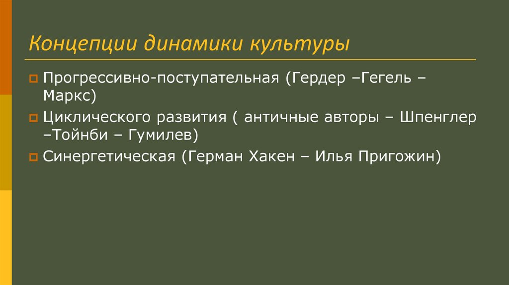 Концепции динамики культурыПрогрессивно-поступательная (Гердер –Гегель –