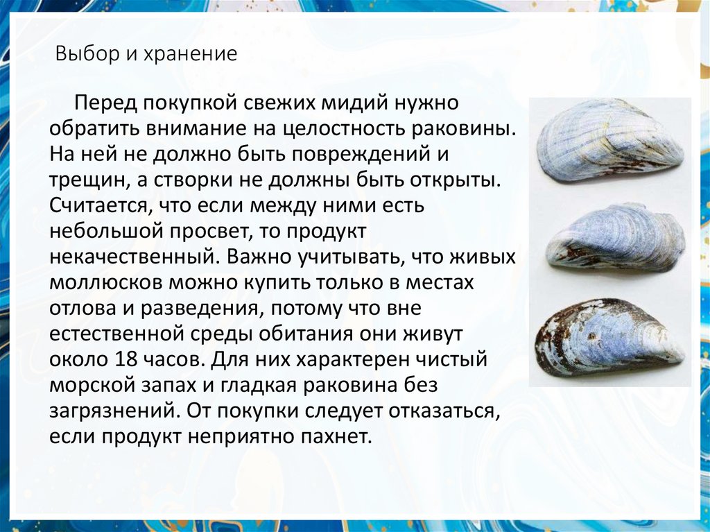 Выбор и хранениеПеред покупкой свежих мидий нужно