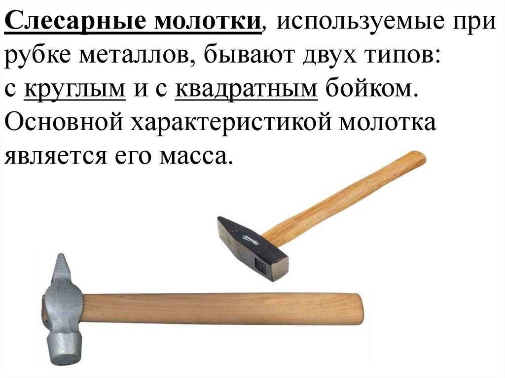 Слесарные молотки, используемые прирубке металлов, бывают двух типов: