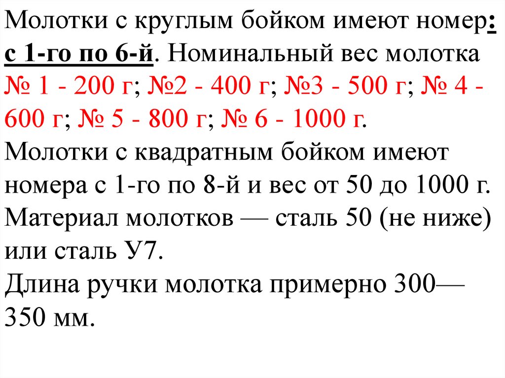 Молотки с круглым бойком имеют номер:с 1-го по 6-й. Номинальный вес молотка