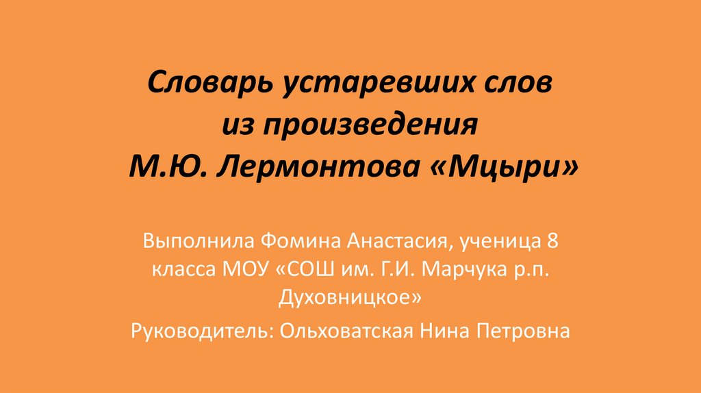 Словарь устаревших слов из произведения М.Ю. Лермонтова «Мцыри»