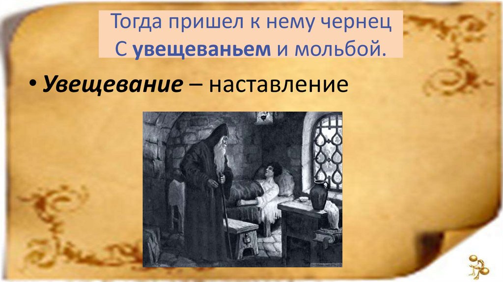 Тогда пришел к нему чернецС увещеваньем и мольбой.