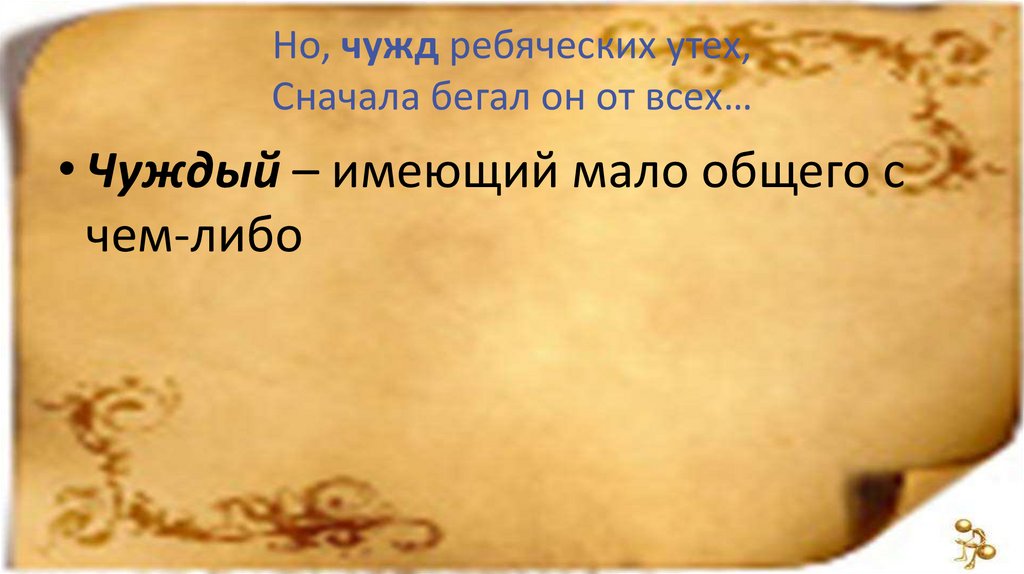 Но, чужд ребяческих утех,Сначала бегал он от всех…