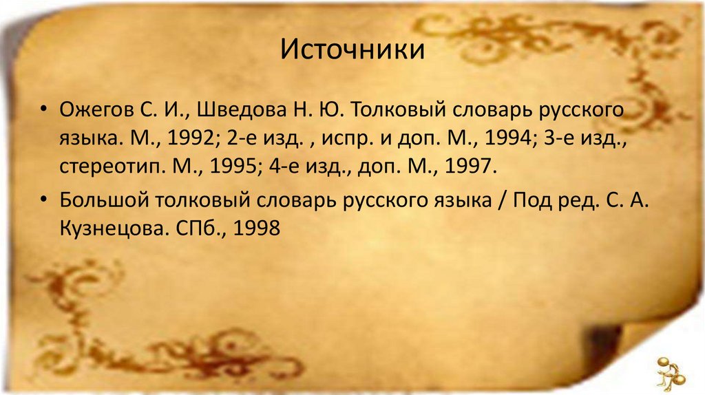 Источники• Ожегов С. И., Шведова Н. Ю. Толковый словарь русского
