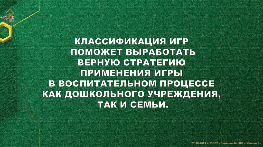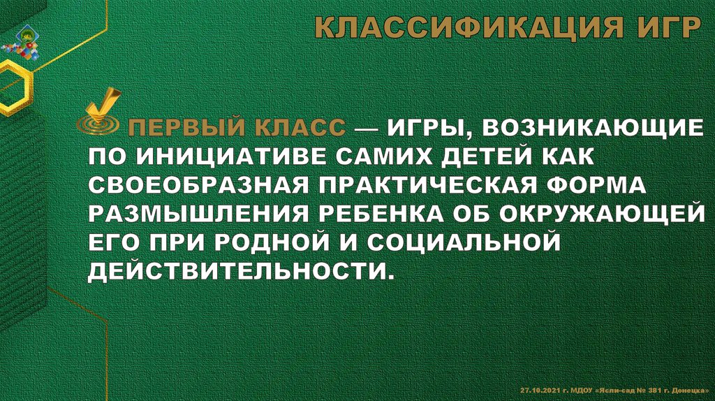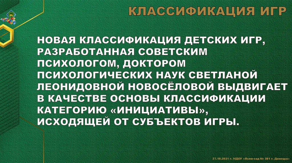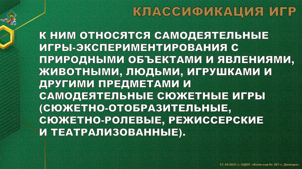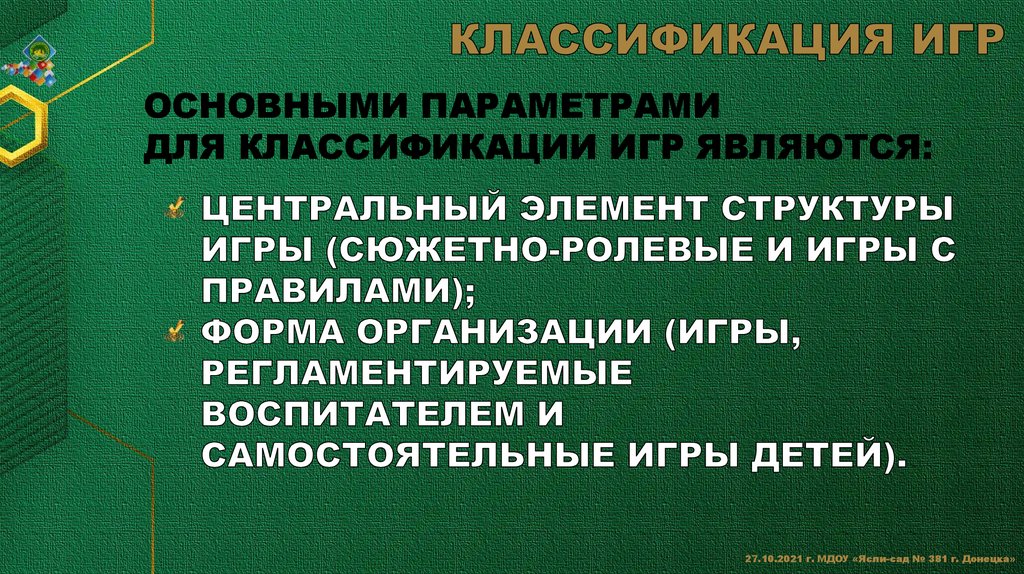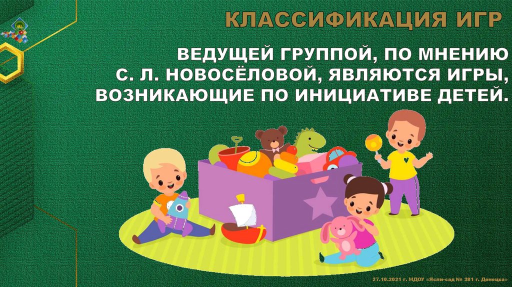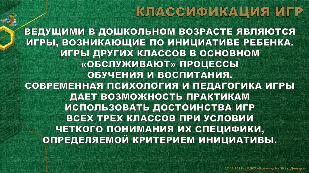 Игровая деятельность в дошкольном учреждении. Миссия игры. Классификация видов игровой деятельности