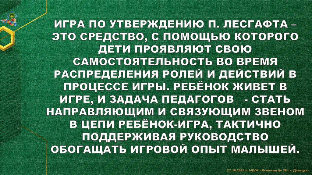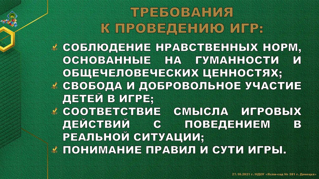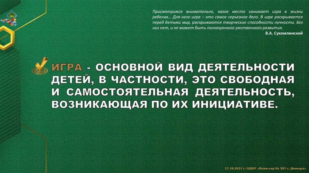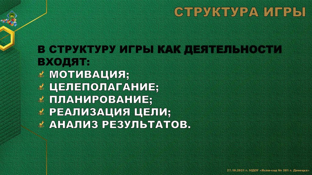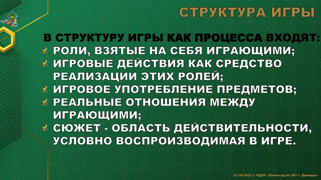 В СТРУКТУРУ ИГРЫ КАК ПРОЦЕССА ВХОДЯТ:27.10.2021 г. МДОУ «Ясли-сад № 381 г. Донецка»