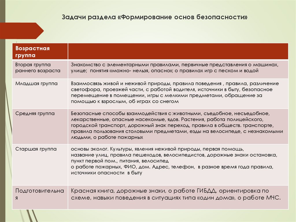 Задачи раздела «Формирование основ безопасности»Возрастная