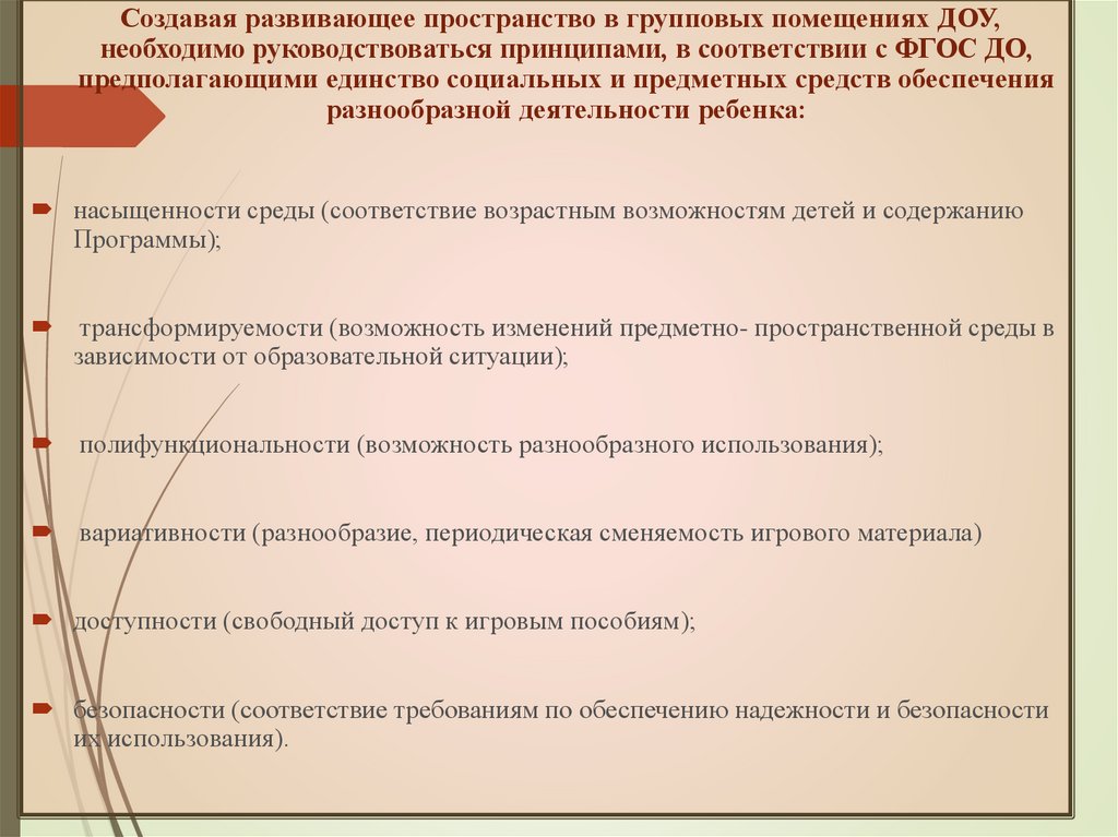 Создавая развивающее пространство в групповых помещениях ДОУ,необходимо руководствоваться принципами, в соответствии с ФГОС ДО,