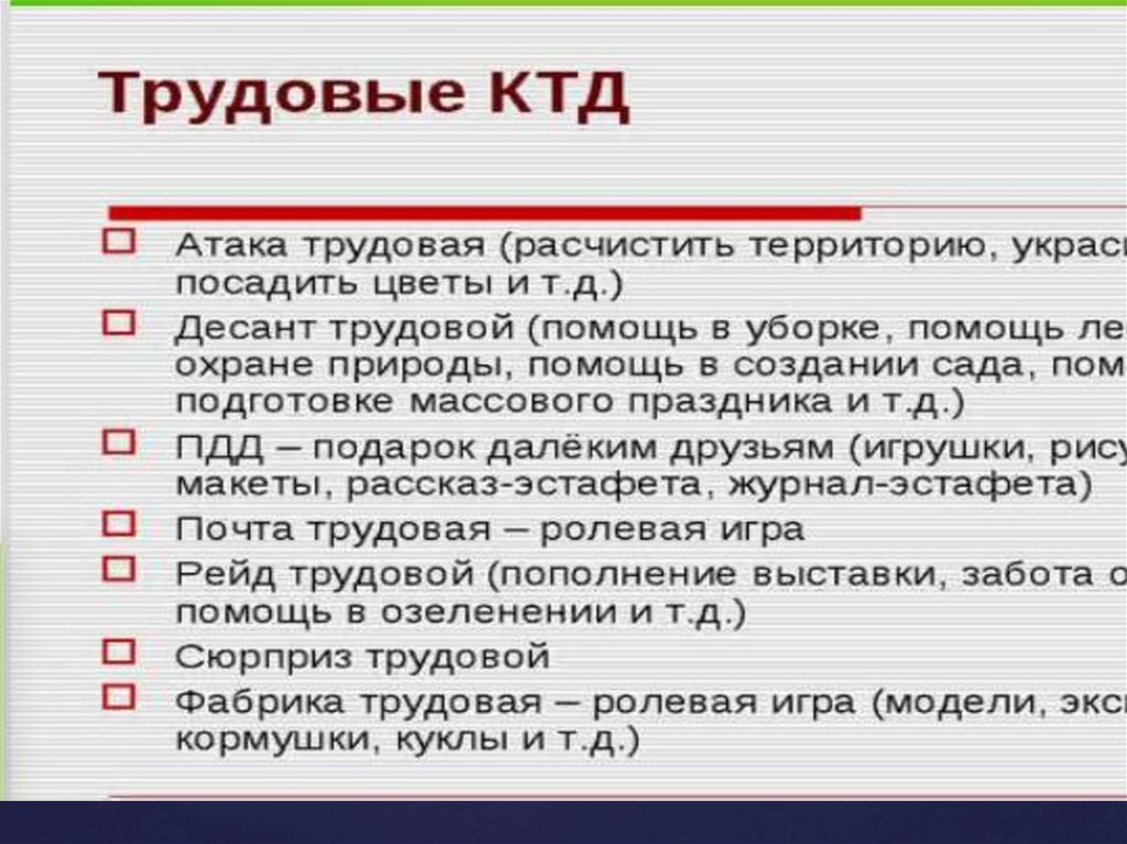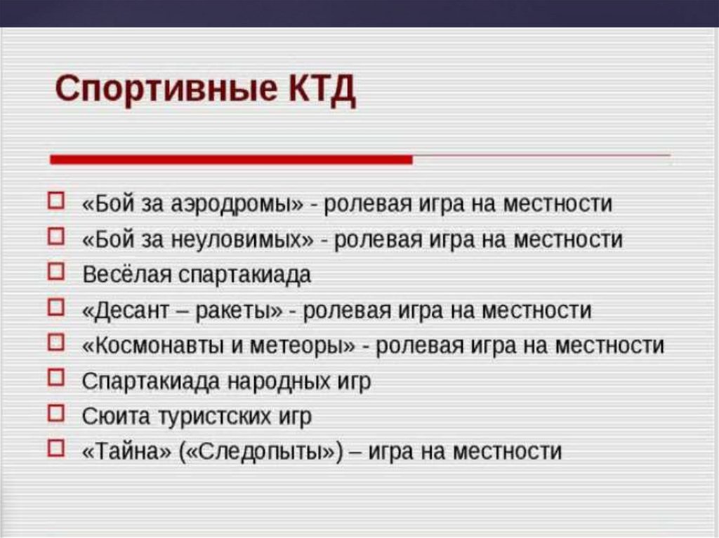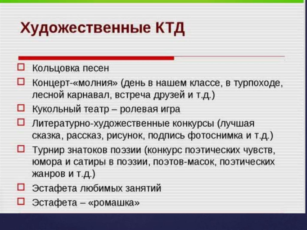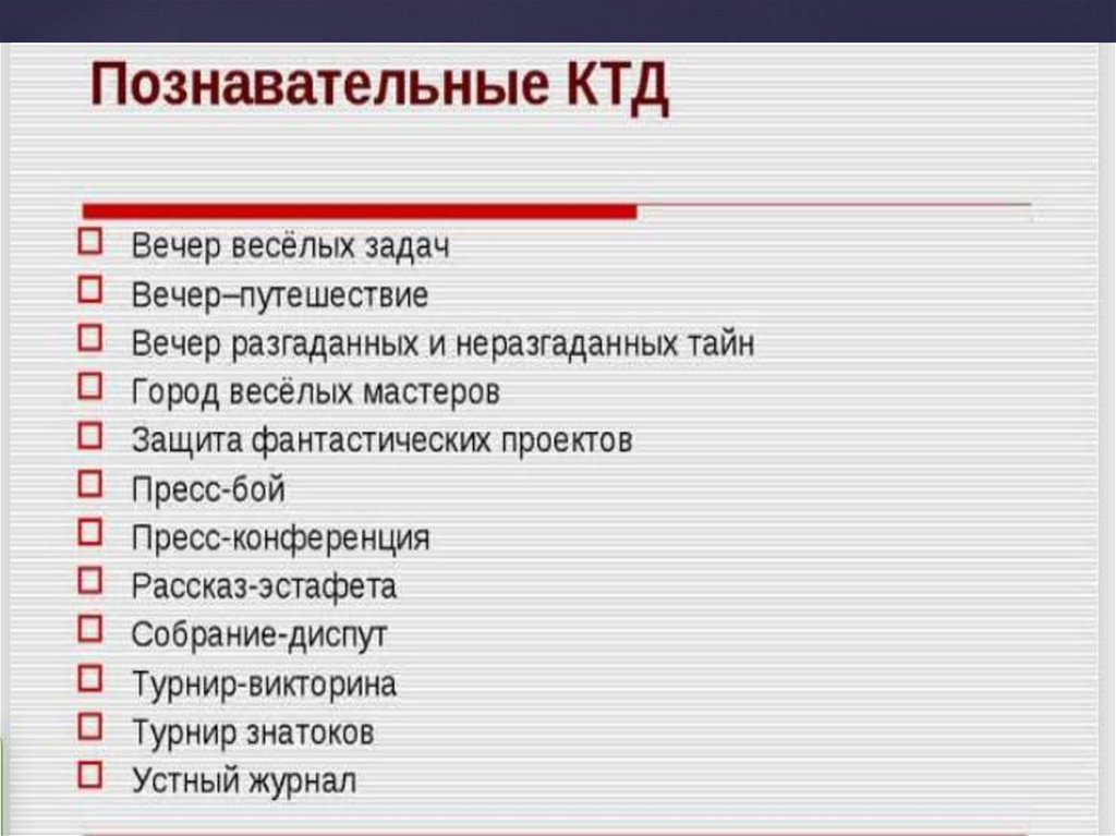 Виды коллективного творческого дела: трудовые КТД, Познавательные КТД, Спортивные КТД